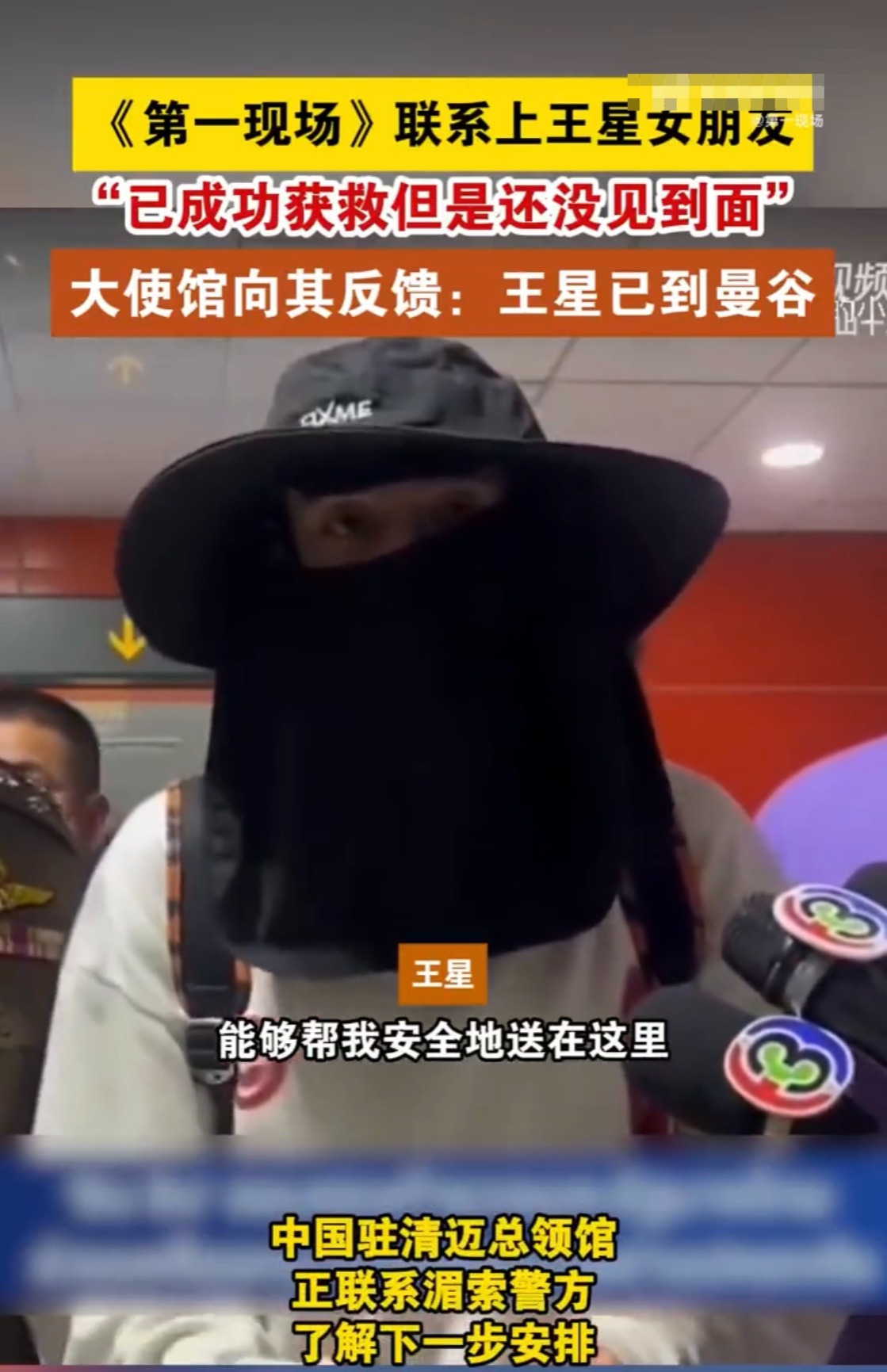 当地时间1月7日,记者从中国驻清迈总领馆得到消息,泰国达府湄索县移民局当天下午召开新闻发布会,表示已找到失联的中国籍男演员王星。中国驻清迈总领馆正联系湄索警方了解下一步安排。1月7日晚9点40分,媒体联系上王星女朋友,对方称:“王星已成功获救,但是还没见到面,具体见面时间还不方便透露,大使馆向其反馈是王星已到达曼谷。”