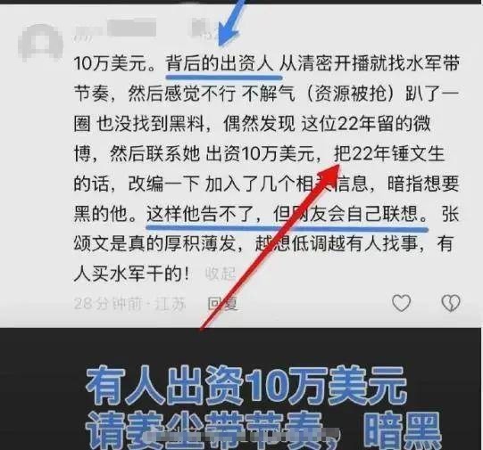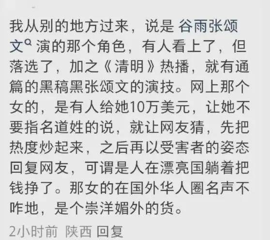 还有人透露《谷雨》张颂文演的那个角色,有人看上了,但落选了,就给了姜尘十万美金,让她先不要指名道姓,让网友猜是张颂文,炒作起来热度,再以受害者的姿态回复网友。