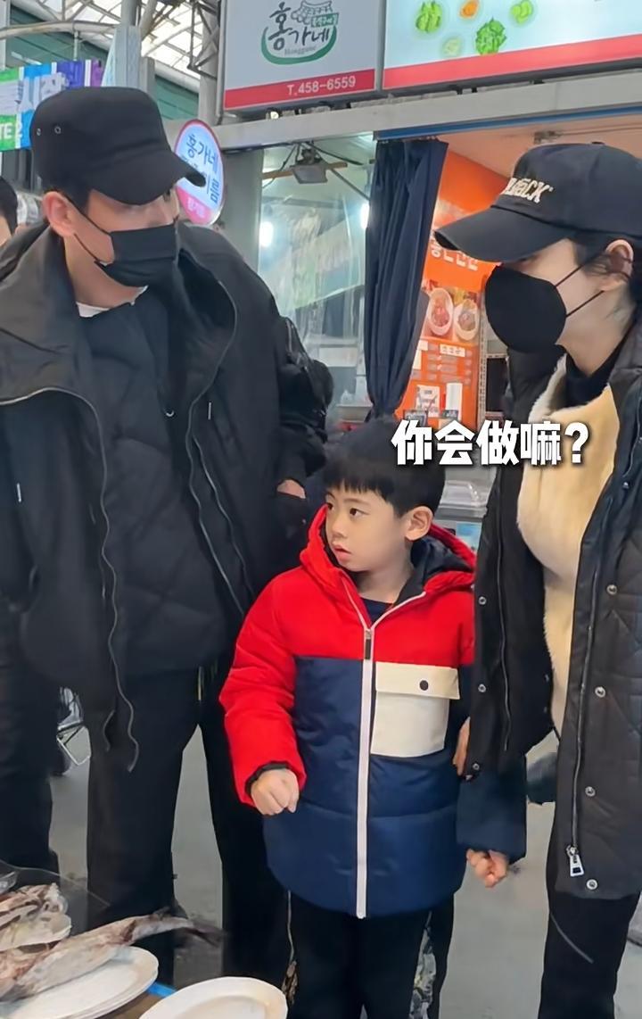 韩国在世界的地理位置跟我们东北那一带差不多,这时候也是冷得直哆嗦,当天,他们包裹得很严实,厚外套里面还每人都加了两三件秋衣打底,整体都穿得很朴素,夫妻两人都是一身黑色,相当素雅,只有宝贝儿子大海的那一抹红,就像是冬日里的一把火,照亮了周遭