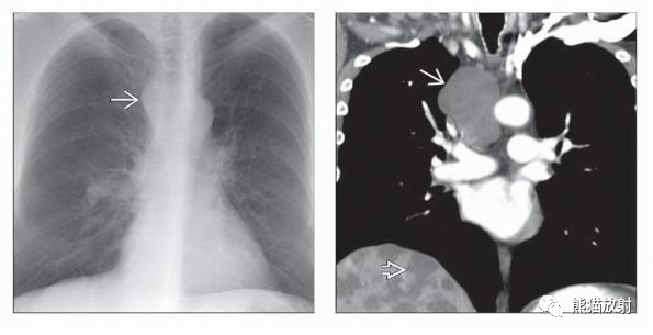 (左) 成人,有症状,支气管源性囊肿,X线片显示大的边界清楚的气管右旁肿块。