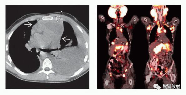 (右) 同一患者,PET/CT显示前纵隔肿块FDG显著摄取,可见中央坏死区,双侧锁骨上区淋巴结肿大。当邻近淋巴结受累时,远处淋巴结受累则提示纵隔大B细胞NHL是弥漫性而不是原发性。