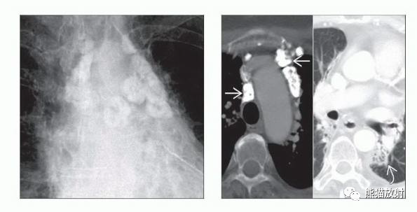 (左) 一例接受放疗的HL患者的PA胸片显示纵隔多发伴大量钙化的增大淋巴结。