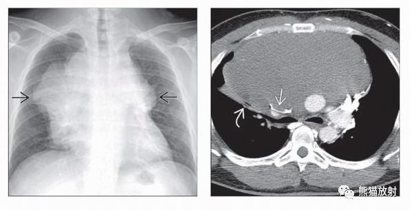 (右)同一患者,心旁间隙多发肿大淋巴结,双侧胸腔积液。注意,尽管病变广泛,但本病例的前纵隔病变不如原发性纵隔NHL明显。