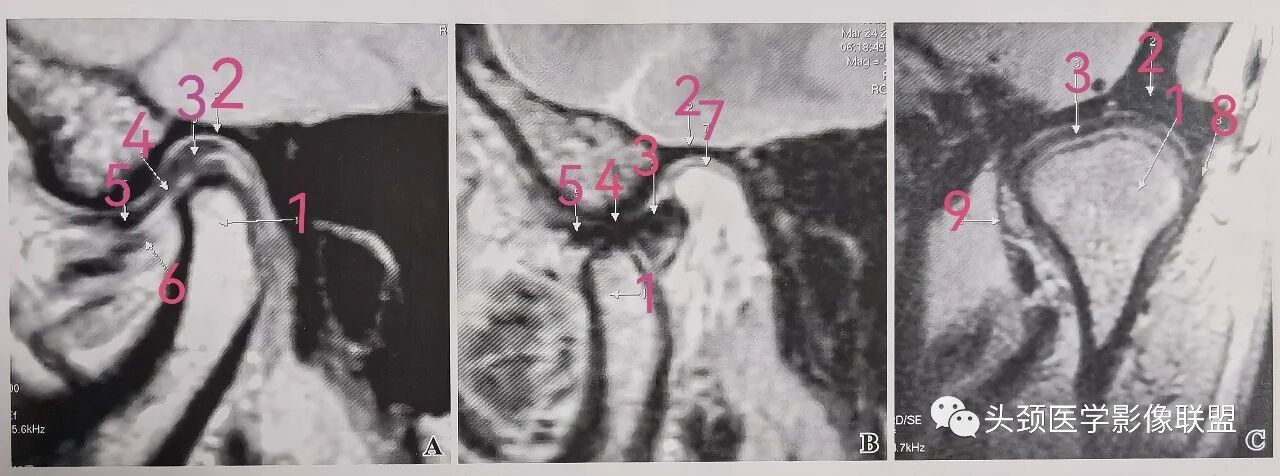 A. 矢状面闭口PD像,B.矢状面开口PD像,C.冠状面闭口PD像:1.下颌髁突;2.颞骨关节面(关节窝);3.关节盘后带;4.关节盘中带;5.关节盘前带;6.翼外肌上头和下头之间的纤维带;7.关节盘后附着;8.外侧关节囊;9.内侧关节囊。
