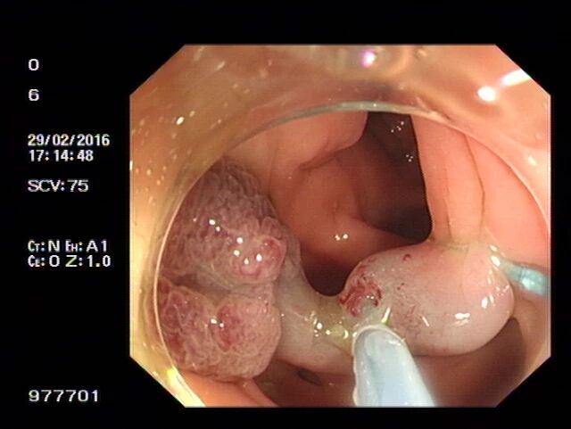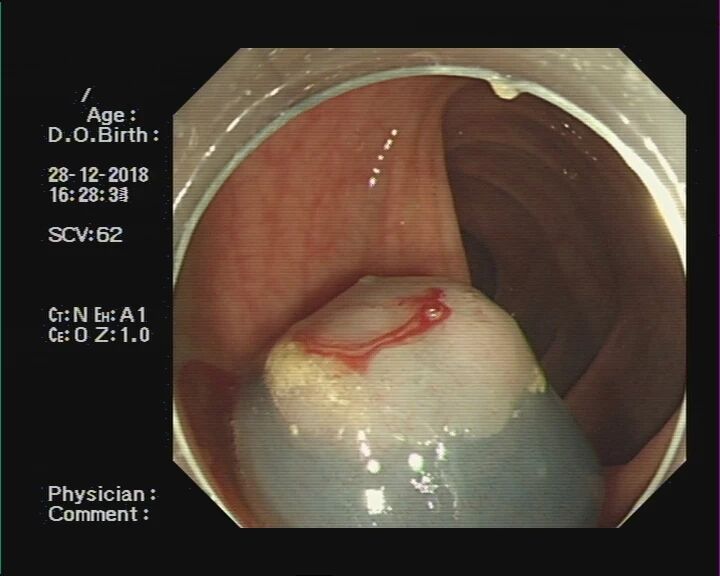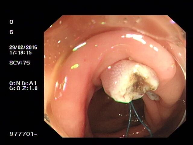 至此,肠镜下切除息肉的操作完成。脱落的息肉需进行病理切片检查,而留置于肠道内的金属夹也将在以后的数日内自行脱落排出体外。