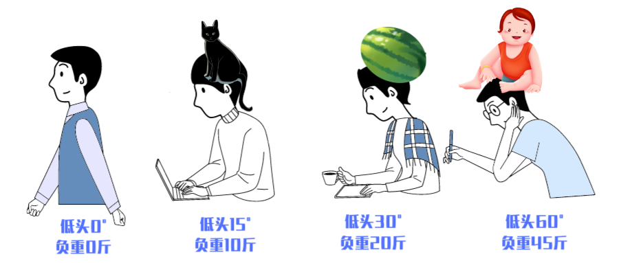 3头部弯到60度的时候,就要承受5~6倍的压力,相当于脖子上放了个54斤的孩子,时间长了脖子能承受不?