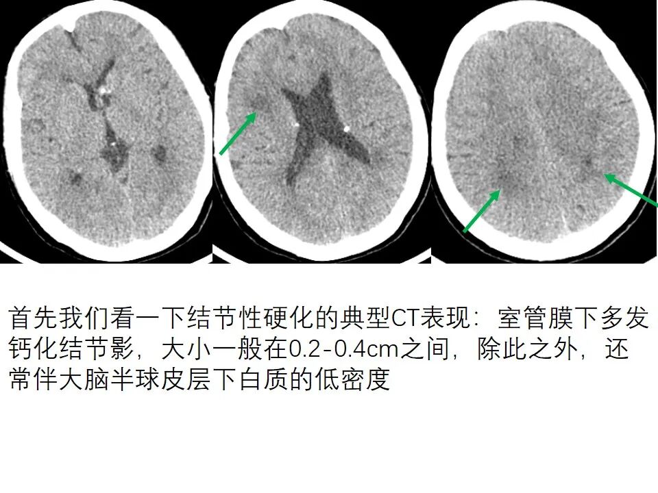 首先我们看一下结节性硬化的典型CT表现:室管膜下多发钙化结节影,大小一般在0.2-0.4cm之间,除此之外,还常伴大脑半球皮层下白质的低密度