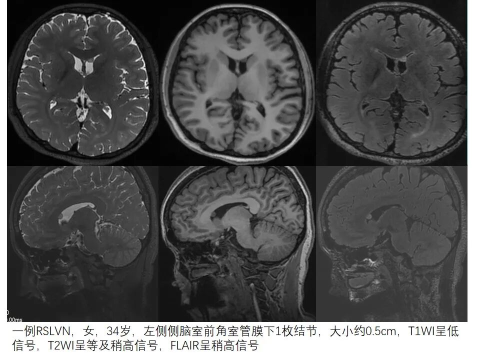 一例RSLVN,女,34岁,左侧侧脑室前角室管膜下1枚结节,大小约0.5cm,T1WI呈低信号,T2WI呈等及稍高信号,FLAIR呈稍高信号