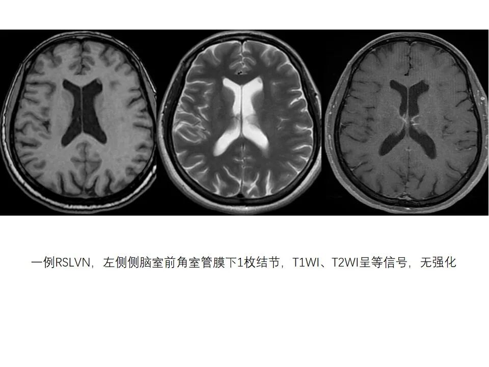 一例RSLVN,左侧侧脑室前角室管膜下1枚结节,T1WI、T2WI呈等信号,无强化