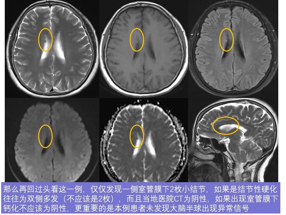 那么再回过头看这一例,仅仅发现一侧室管膜下2枚小结节,如果是结节性硬化往往为双侧多发(不应该是2枚),而且当地医院CT为阴性,如果出现室管膜下钙化不应该为阴性,更重要的是本例患者未发现大脑半球出现异常信号
