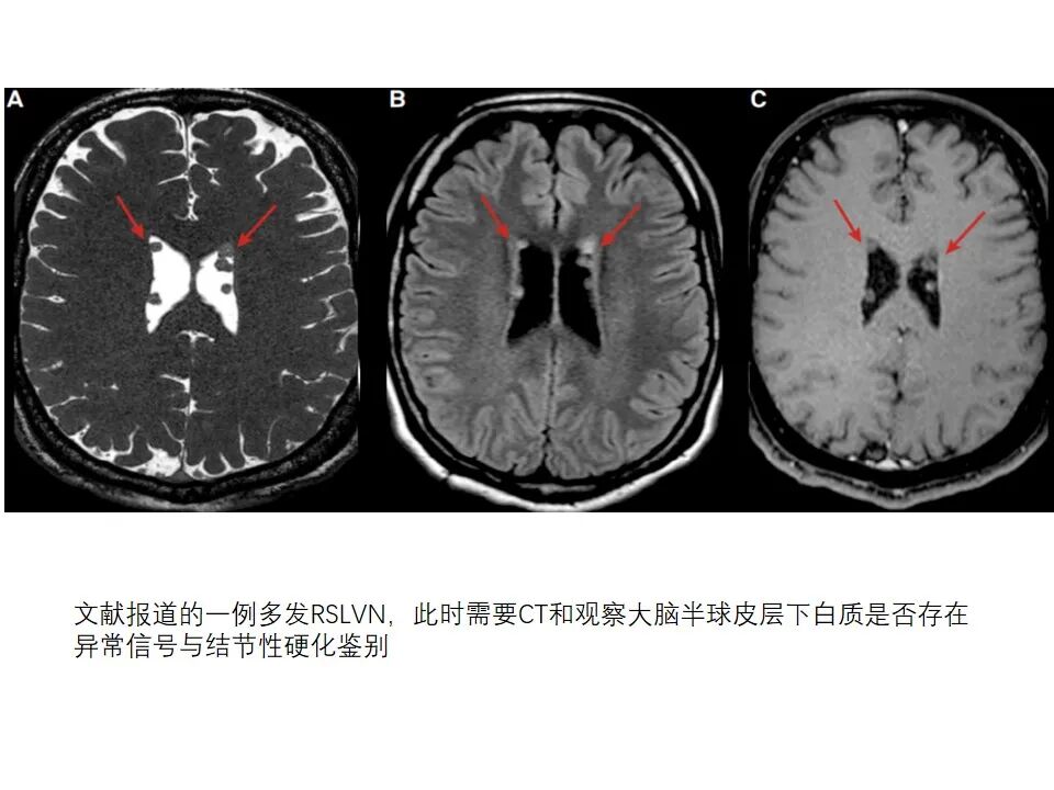 文献报道的一例多发RSLVN,此时需要CT和观察大脑半球皮层下白质是否存在异常信号与结节性硬化鉴别