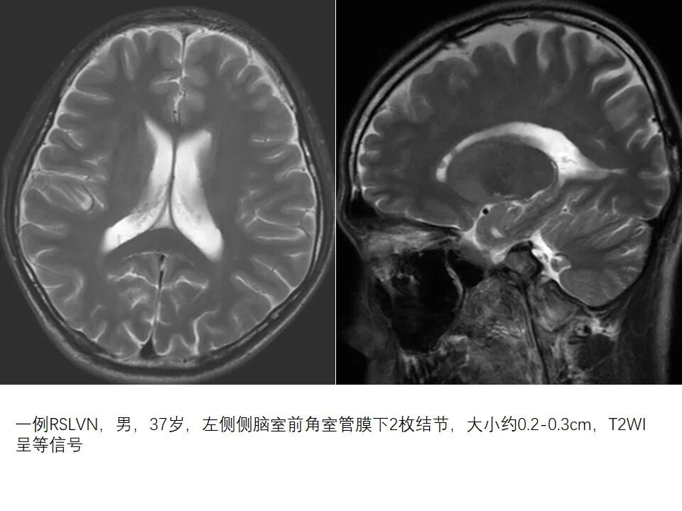 一例RSLVN,男,37岁,左侧侧脑室前角室管膜下2枚结节,大小约0.2-0.3cm,T2WI呈等信号
