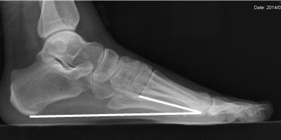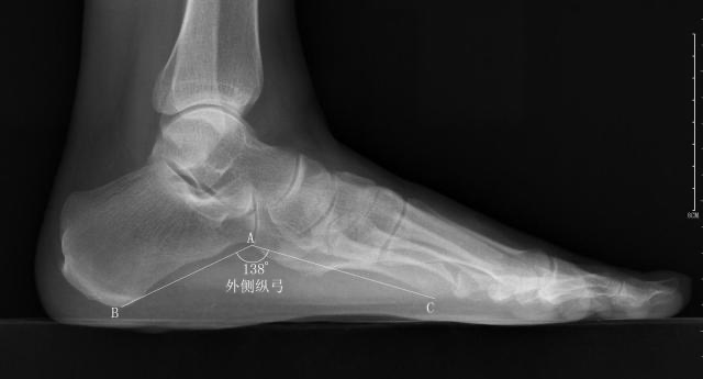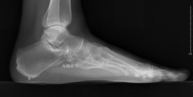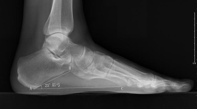 测量方法:从跟骨的最低点到距骨头的最低点作一条直线,再从距骨头的最低点到第1跖骨头最低点作一条直线,然后测量两条直线所构成的夹角