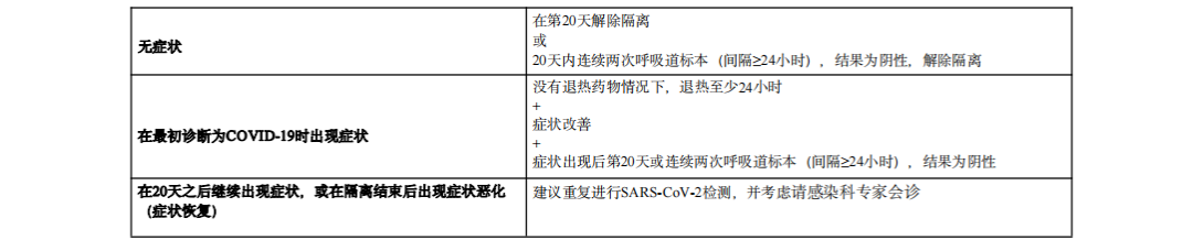 建议使用下表来判断中度/重度免疫缺陷患者的SARS-CoV-2聚合酶链反应(PCR)/抗原检测。这些患者可能会在20天以上产生具有复制能力的病毒。建议结束隔离并请感染科专家会诊。