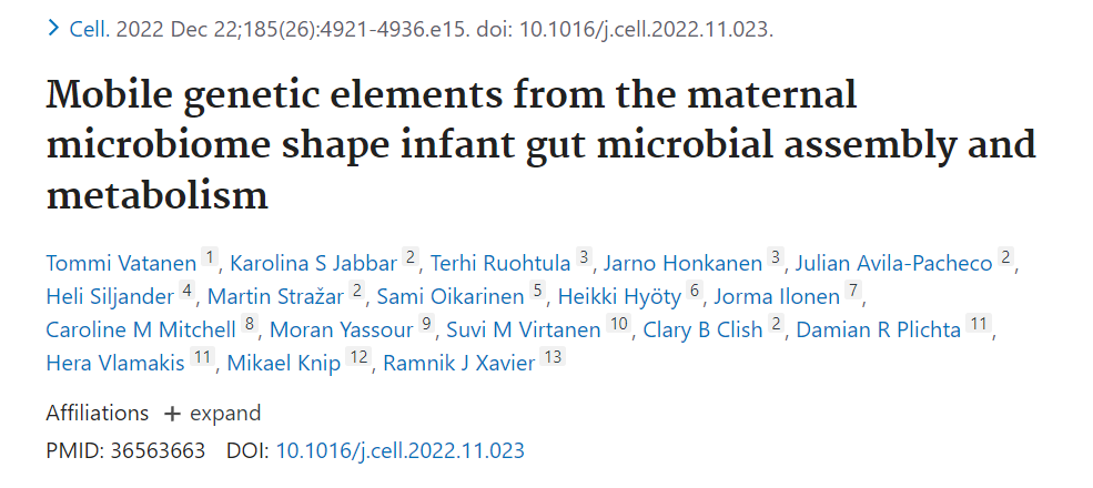 近日,美国麻省理工学院、哈佛大学Broad研究所等机构的研究人员合作在Cell上发表了题为“Mobile genetic elements from the maternal microbiome shape infant gut microbial assembly and metabolism”的文章。研究团队利用70对母婴组合的纵向多组学数据,追踪了从妊娠后期到婴儿一岁期间微生物组和代谢组的共同发育,发现了大规模母婴可移动遗传元件的转移,主要涉及与饮食相关的适应性基因。该综合分析扩展了肠道微生物组垂直传播的概念,并为孕晚期和产后初期的母婴微生物组和代谢组的发展提供了原创性见解。