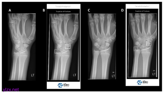 图 在这个例子中,左手腕视图(A)和(C)已经提交给AI解释。人工智能通过在各自的放射图像上显示边界框作为“覆盖”来标记儿童舟状骨和尺骨茎突骨折(B, D)。这些数据也被发送到PACS供放射学记者和临床医生审查