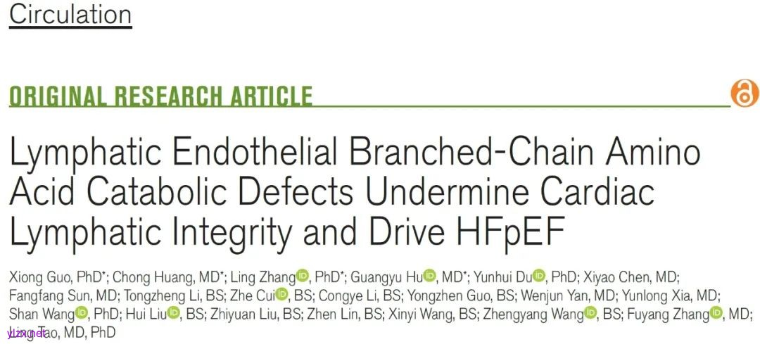 2025年4月1日,空军军医大学西京医院心血管内科陶凌和张富洋团队在Circulation上发表了题为“Lymphatic Endothelial Branched-Chain Amino Acid Catabolic Defects Undermine Cardiac Lymphatic Integrity and Drive HFpEF”的研究论文。该研究首次揭示了心脏淋巴管结构损伤和功能障碍等退化性病变是HFpEF明显区别于HFrEF的重要致病因素,并发现淋巴管内皮细胞(LEC)的支链氨基酸代谢紊乱是破坏心脏淋巴管完整性并驱动HFpEF发生发展的关键机制。这一研究为理解HFpEF病理生理机制提供了全新视角,并为靶向心脏淋巴管开发HFpEF治疗策略提供了实验基础和理论依据。