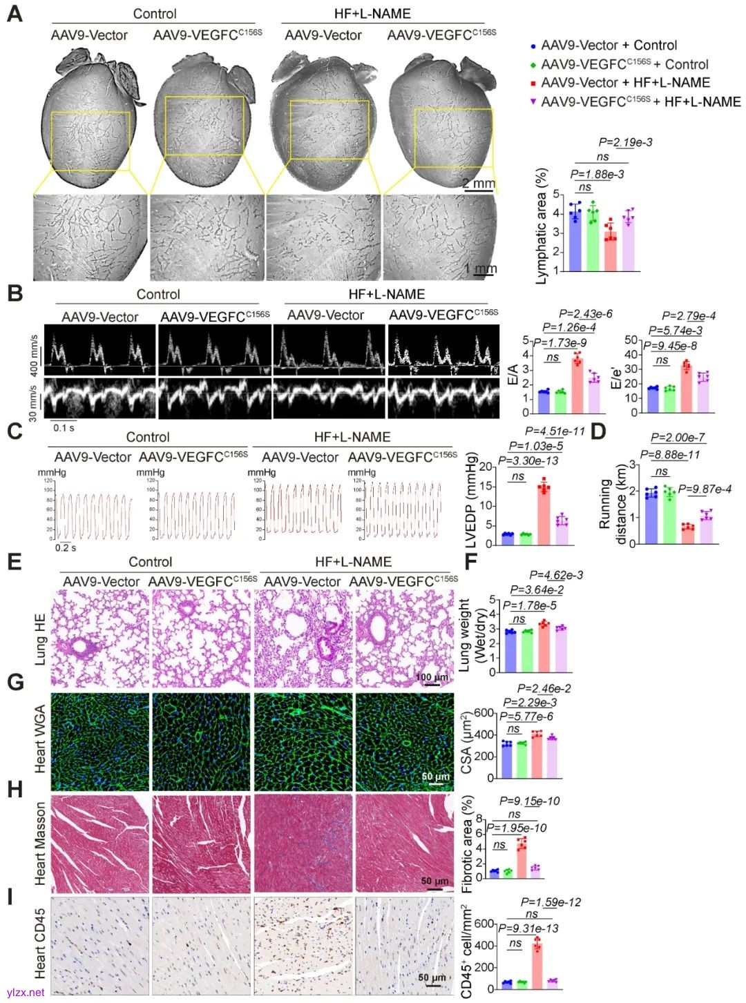 图2. 刺激淋巴管新生减轻心脏淋巴管退化性病变并改善HFpEF