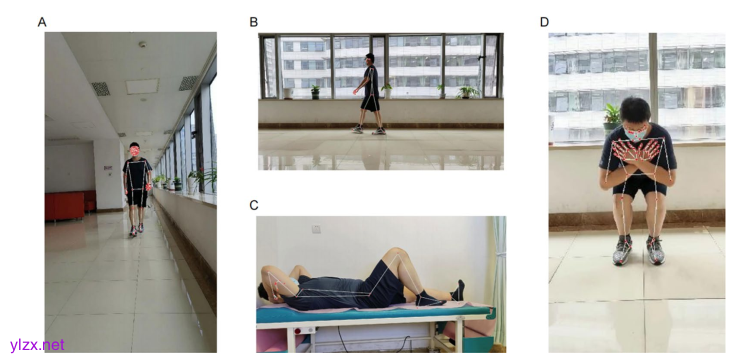 患者步态分析:A定时站立(TUG)测试,B 6米步行,C仰卧膝关节屈曲,D下蹲和站立