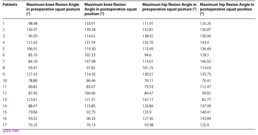 17名能够进行蹲立运动的患者术前和术后蹲位屈曲角度的比较