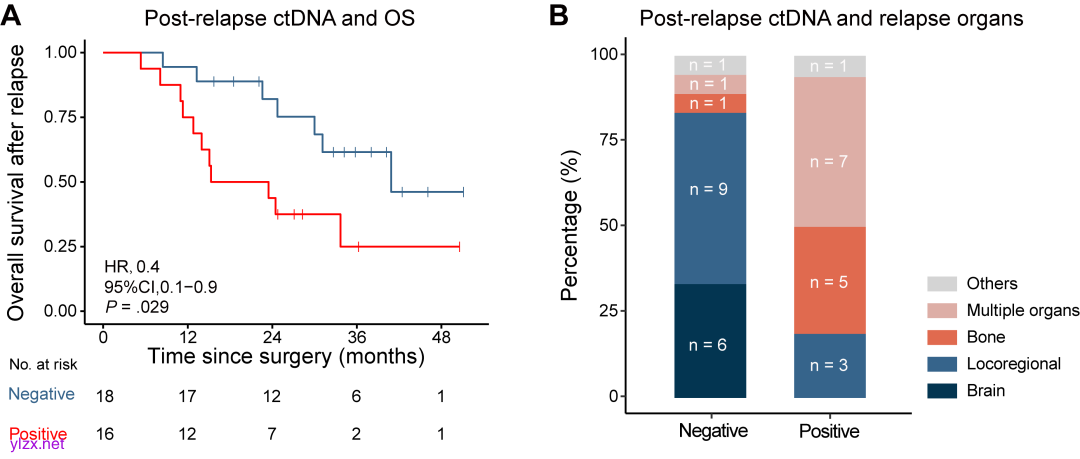 本研究中有34例复发患者采集了复发后血浆样本,其中18例复发后ctDNA呈阴性,16例呈阳性。复发后ctDNA阴性与复发后总生存期(OS)较好显著相关(HR=0.4,95% CI=0.1~0.9,P=0.029)。复发后ctDNA阴性患者的中位OS为40.9个月,而阳性患者为19.4个月。在复发后ctDNA阴性患者中,大多数为脑转移或局部复发(83.3%,15/18),而复发后ctDNA阳性患者多为骨转移或多器官复发(75.0%,12/16),这些转移器官的差异可能解释了为何复发后ctDNA阴性患者在疾病复发后仍能获得较好的生存期(图4)。综上,复发后ctDNA状态可预测复发患者的治疗结局。