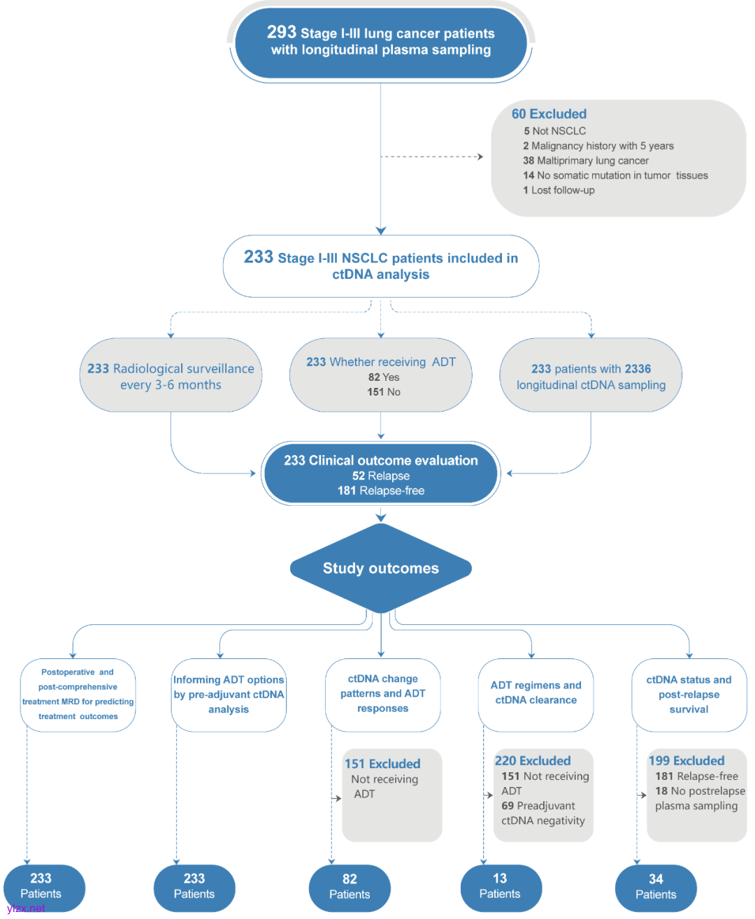 LUNGCA为前瞻性多中心队列研究,对接受根治性手术的I-III期NSCLC患者进行动态ctDNA监测。本次分析纳入LUNGCA队列中的233名患者,ctDNA分析覆盖术前血浆样本、术后3天及1个月样本,之后每3-6个月随访一次,持续至术后3年,共2336份动态血浆样本(图1)。