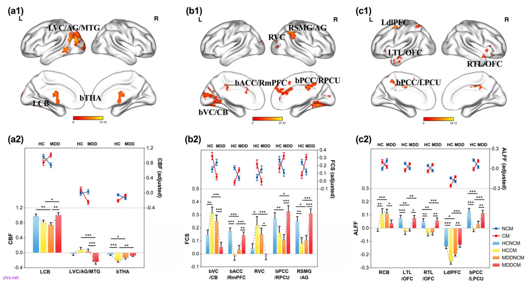 图2:MDD×CM对CBF、FCS和ALFF的交互作用