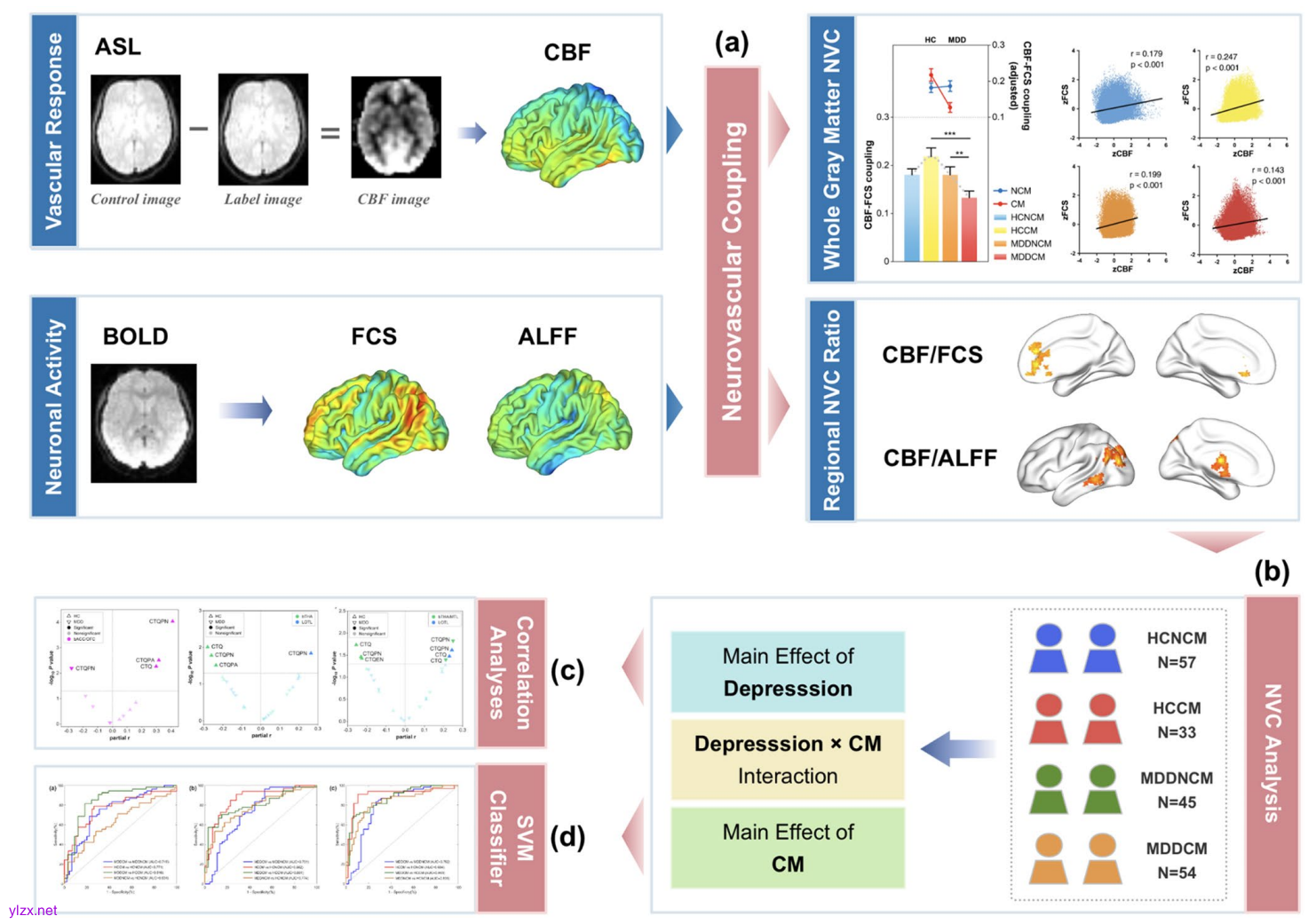 研究团队招募了189名青少年,分为四组:54名伴有童年虐待的抑郁症患者(MDDCM)、45名不伴童年虐待的抑郁症患者(MDDNCM)、33名伴有童年虐待的健康对照组(HCCM)以及57名不伴童年虐待的健康对照组(HCNCM)。所有参与者接受了包括结构磁共振成像(T1)、动脉自旋标记(ASL)和静息态功能磁共振成像(rs-fMRI)在内的多模态扫描。通过计算全脑灰质水平的脑血流量(CBF)与神经元活动(功能连接强度FCS和低频波动振幅ALFF)的相关系数,以及区域水平的CBF/神经元活动比值,评估神经血管耦合的状态。此外,研究采用支持向量机(SVM)分类器,结合异常的NVC比值、CBF和神经元活动特征,对青少年抑郁症患者进行分类识别。统计分析通过双因素协方差分析(ANCOVA)探讨抑郁症与童年虐待的交互作用,并进一步分析了异常NVC比值与童年虐待严重程度的相关性。