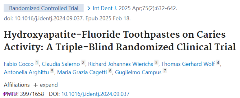 Cocco F, Salerno C, Wierichs RJ, Wolf TG, Arghittu A, Cagetti MG, Campus G. Hydroxyapatite-Fluoride Toothpastes on Caries Activity: A Triple-Blind Randomized Clinical Trial. Int Dent J. 2025 Apr;75(2):632-642. doi: 10.1016/j.identj.2024.09.037. Epub 2025 Feb 18. PMID: 39971658.
