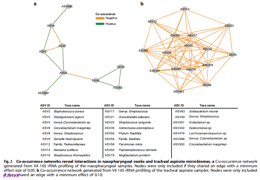 利用Dirichlet多项模型对微生物群进行聚类分析,发现鼻咽微生物群可分为四个不同的簇。其中,NS1簇中多枝菌属和棒状杆菌属的丰度较高;NS2簇的群落更为多样和均匀;NS3簇主要由金黄色葡萄球菌主导;NS4簇中金黄色葡萄球菌和多枝菌属的含量相似,但主要由麦氏棒状杆菌(Corynebacterium macginleyi)主导。气管吸出物微生物群可分为两个簇,TA1簇多种分类群的定植率较高,尤其是链球菌等;TA2簇的群落组成更为均匀,没有单一优势分类群。进一步分析发现,鼻咽微生物群的多样性与年龄呈弱正相关,年龄能够解释鼻咽微生物群多样性和组成的显著差异,且不同鼻咽微生物群与年龄密切相关,随着年龄增长,微生物群从以多枝菌属和棒状杆菌属为主逐渐转变为以金黄色葡萄球菌为主,再到更复杂多样的群落。然而,气管吸出物微生物群的多样性与年龄、性别、种族等因素均无显著关联。