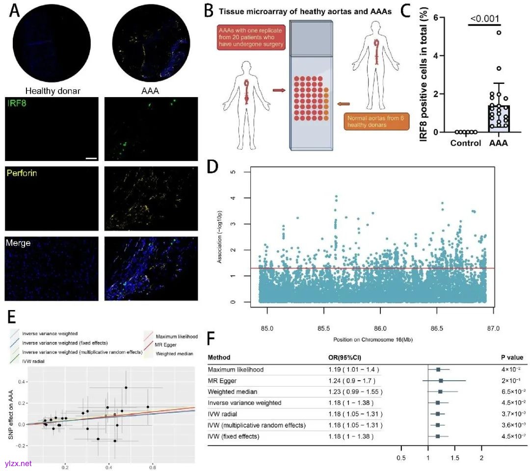 随后,研究团队通过多重免疫组织化学方法,检测到人主动脉组织芯片中IRF8表达水平在AAA组织中显著升高。来自UK Biobank的泛人群GWAS数据分析显示,IRF8基因位点的多个变异与AAA发生呈显著相关。
