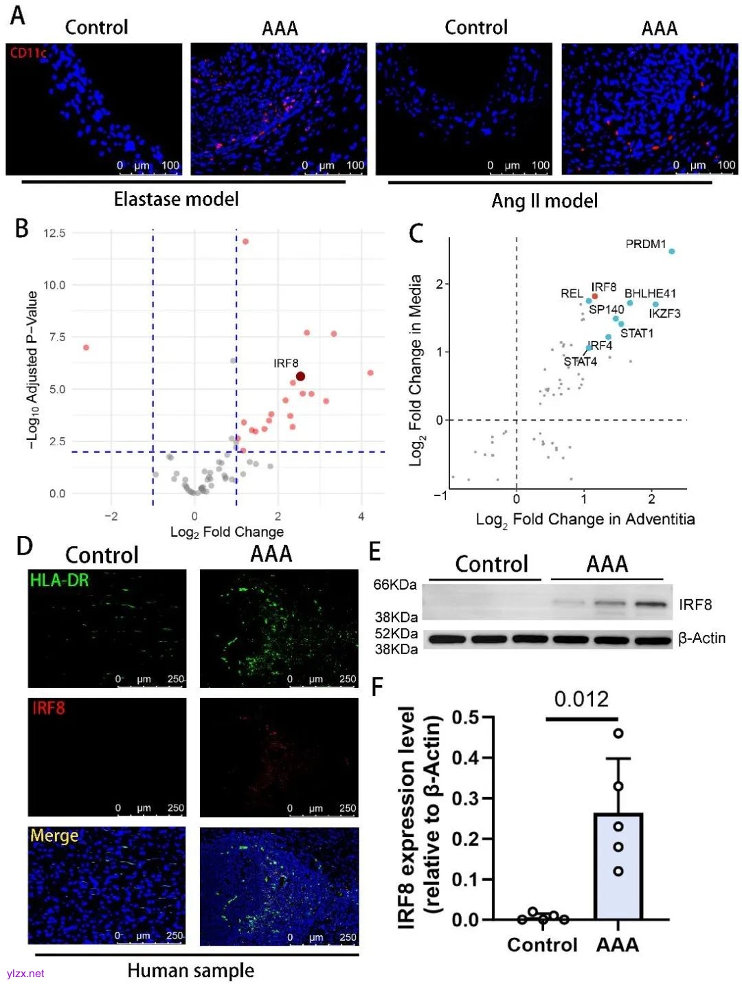 起初,研究团队观察到弹性蛋白酶诱导小鼠14天后主动脉内膜和外膜层中CD11c+细胞的数量显著增加。研究团队分析了AAA患者主动脉组织的转录组测序数据,并鉴定出干扰素调节因子8 (IRF8)为显著变化最为明显的基因之一。ImmGen数据库对这些差异表达转录因子的分析进一步证实,IRF8在树突状细胞谱系中特异性富集,提示IRF8可能介导DC细胞对AAA的促扩张作用。