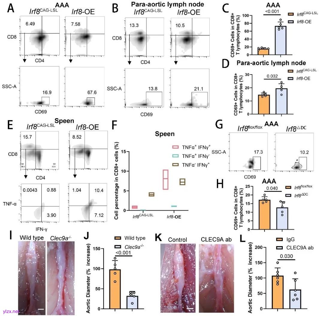 IRF8对于cDC1亚群的分化成熟起着至关重要的作用。鉴于cDC1在免疫反应中的主要作用是向CD8+ T细胞呈递抗原,研究团队进一步探讨了CD8+ T细胞在AAA进展中的作用。在Irf8-OE小鼠体内,成熟CD8+ T细胞显著增加。相反地,Irf8ΔDC小鼠则表现为成熟CD8+ T细胞数量的明显减少。随后,研究团队使用了Clec9a-/-小鼠,发现这些小鼠表现出类似于Irf8ΔDC小鼠的动脉瘤扩张减轻的特征。此外,腹腔注射CLEC9A中和抗体能够有效缓解弹性蛋白酶诱导的AAA扩张,其效果显著优于对照IgG组。