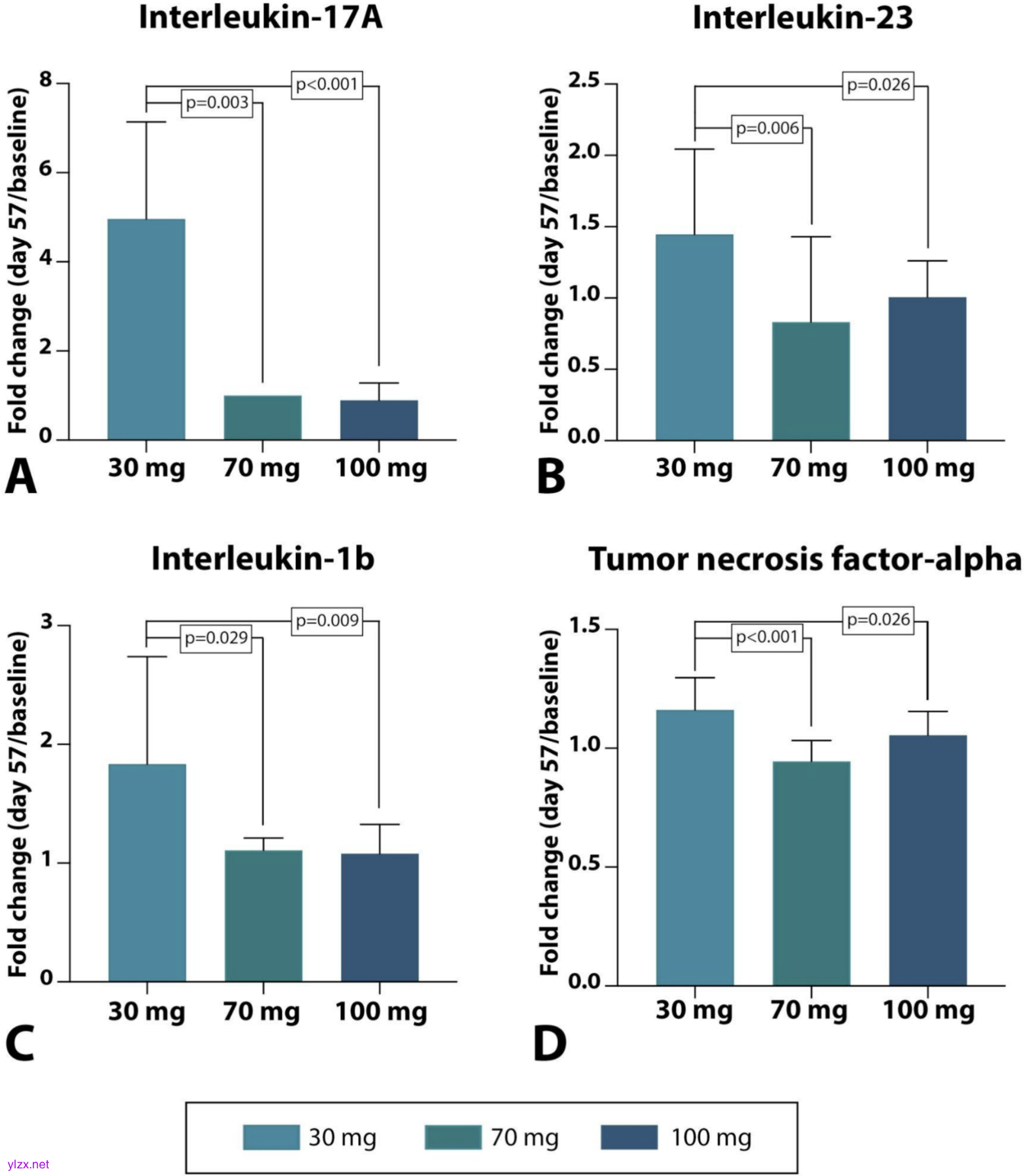 这项研究共纳入13名患者,其中3人接受30 mg剂量,3人接受70 mg剂量,7人接受100 mg剂量。总体来看,11名患者完成了研究,2名患者因个人原因在100 mg组退出。研究人群的基本特征显示,77%为男性,中位年龄为53岁(四分位距[IQR]:49–61岁)。基线MRI-PDFF中位值为18.4%(IQR:8.4%–34.0%),MRE中位值为2.5 kPa(IQR:2.2–2.6 kPa)。在安全性方面,最常见的不良事件为高尿酸血症(13%,均为轻度)和胰腺酶升高(11%,包括轻度和中度病例)。没有发生严重不良事件或显著的肝功能异常。这表明古塞库单抗在高达100 mg的剂量下具有良好的安全性。在疗效方面,研究发现,70 mg和100 mg剂量组中外周血IL-17、IL-23、IL-1β和TNF-α水平显著下降。此外,患者的酒精摄入量随时间显著减少,AUDIT-C评分从基线的6(IQR:3–7)降低至5(IQR:1–6),差异具有统计学意义(p=0.023)。