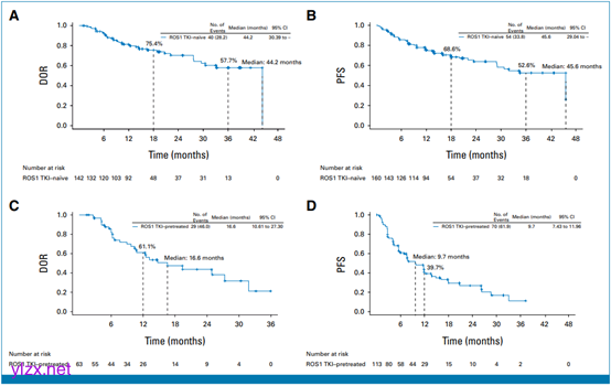截至2024年6月7日,TRUST-I和TRUST-II试验共纳入273例患者。在TKI初治患者中(n=160),cORR为88.8%,IC-cORR为76.5%;在TKI预处理患者中(n=113),cORR为55.8%,IC-cORR为65.6%。在TKI初治患者中,中位DOR和中位PFS分别为44.2个月和45.6个月;在TKI预处理患者中,中位DOR和中位PFS分别为16.6个月和9.7个月。在携带G2032R突变的患者中,cORR为61.5%。
