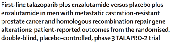 Lancet Oncol | TALAPRO-2试验结果:他拉唑帕尼联合恩杂鲁胺在转移性去势抵抗性前列腺癌患者中的生活质量改善