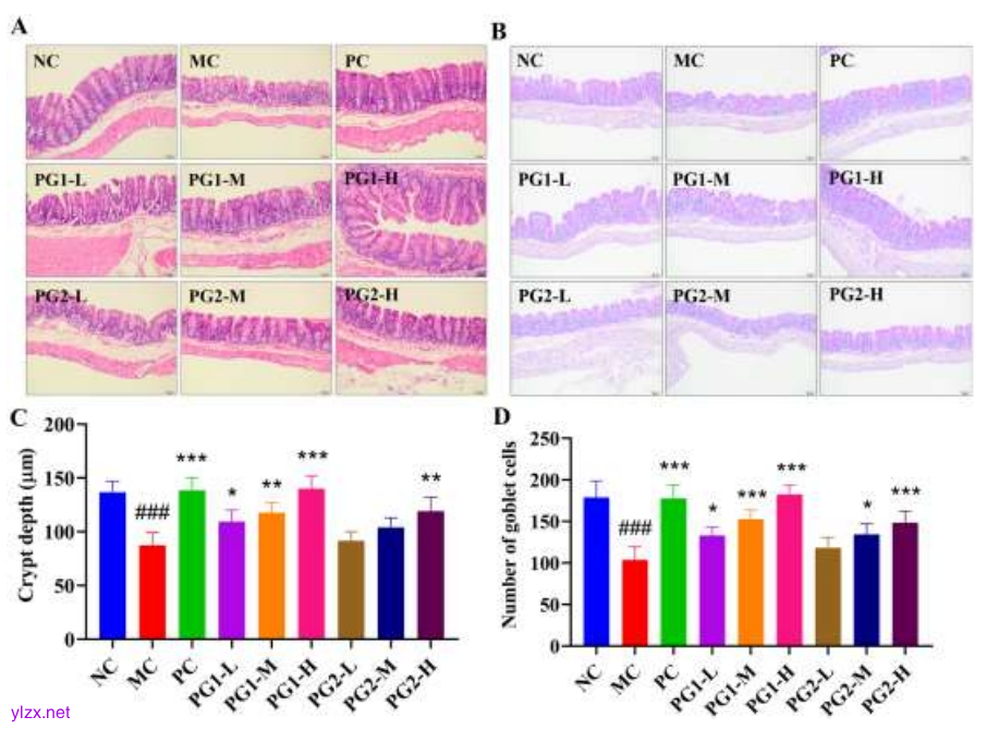此外,组织学分析表明,MC组小鼠盲肠隐窝深度和杯状细胞数量显著减少,这暗示了肠屏障功能的损害(图3)。尽管PG1和PG2均能改善这些变化,但高剂量PG1治疗带来了最为显著的治疗效果。综上所述,高剂量PG1干预能够有效预防由HFD诱导的肝组织、附睾脂肪和盲肠组织中功能失调的组织病理学改变。