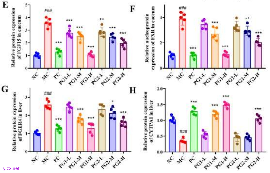 图6A-D揭示,HFD显著提升了盲肠中法尼酯X受体(FXR)和成纤维细胞生长因子15(FGF15)的表达水平,同时增加了成纤维细胞生长因子受体4(FGFR4)的表达,并导致肝脏中胆固醇7α-羟化酶(CYP7A1)的表达减少。然而,高剂量的PG1干预显著逆转了这些变化趋势。