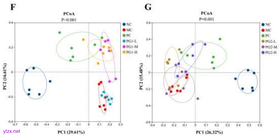 在PG1-H组中,Shannon指数(该指数反映了肠道菌群的均匀性和多样性)显著上升(图5A)。这一变化表明,高剂量的PG1能够显著提升微生物群落的多样性。在门水平上的分析揭示了HFD小鼠与标准饮食小鼠之间肠道微生物组成存在显著差异(图5B-E)。通常情况下,小鼠的肠道菌群主要由厚壁菌门和拟杆菌门构成。MC组小鼠摄入HFD后,导致厚壁菌门数量增加而拟杆菌门数量减少,进而使得厚壁菌门与拟杆菌门的比例上升。然而,PG1和PG2的高剂量治疗显著降低了这一比例。主坐标分析(PCoA)展现了肠道微生物群落(GM)结构的显著变化,突显了NC组与MC组之间群落结构的显著差异(图5F-G)。研究结果表明,高剂量PG1干预能够显著逆转由HFD引起的肠道生态失调,其效果在PC组中甚至超过了辛伐他汀的干预效果。