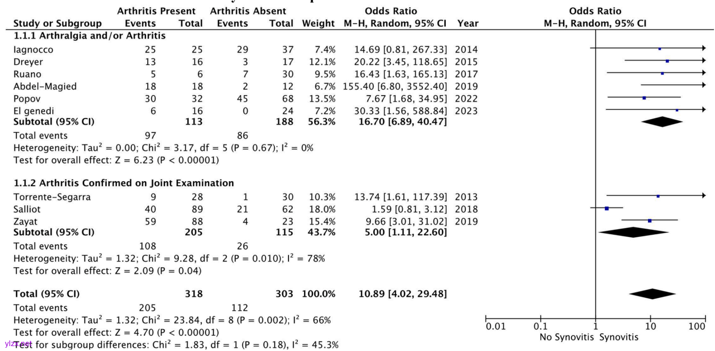 · 滑膜炎/腱鞘炎:16项研究中,14项(87.5%)报告滑膜炎异常,12项(85.7%)采用OMERACT定义及半定量评分。合并分析显示,超声滑膜炎与临床关节炎的关联强度为OR=10.89(95% CI 4.02-29.48),若限定于医生确认的关节炎病例,关联性降至OR=5.00(1.11-22.60)。