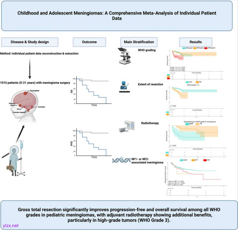 儿童脑膜瘤(PMs)是中枢神经系统罕见肿瘤,占所有脑膜瘤的1%-5%,其临床、病理及分子特征与成人显著不同。现有指南主要针对成人患者,缺乏针对儿童的循证管理策略。本研究通过整合全球20项研究(2011-2023年)的纵向个体化数据(IPD),首次系统评估儿童脑膜瘤的无进展生存期(PFS)和总生存期(OS),重点探讨世界卫生组织(WHO)分级、神经纤维瘤病(NF)状态、手术切除范围(EOR)及辅助放疗对预后的影响,旨在为制定儿童特异性治疗指南提供依据。