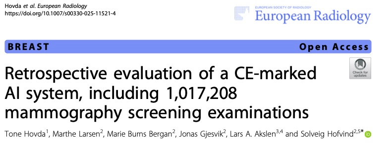 Tone Hovda,Marthe Larsen,Marie Burns Bergan,et al.Retrospective evaluation of a CE-marked AI system, including 1,017,208 mammography screening examinations.DOI:10.1007/s00330-025-11521-4