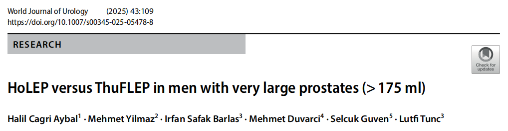 Aybal HC, Yilmaz M, Barlas IS, Duvarci M, Guven S, Tunc L. HoLEP versus ThuFLEP in men with very large prostates (> 175 ml). World J Urol. 2025 Feb 7;43(1):109. doi: 10.1007/s00345-025-05478-8. PMID: 39918564.