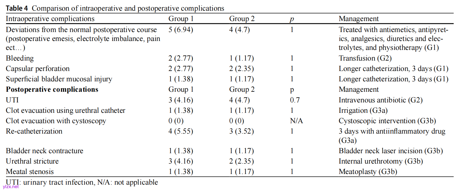 结果显示,与基线值相比,所有组在术后1个月、6个月和12个月时,国际前列腺症状评分(IPSS)、最大尿流率(Qmax)、残余尿量(PVR)和生活质量等功能参数均有显著改善。除术后第1个月的IPSS(3.22±1.77 vs. 2.07±1.11;p=0.001)外,两组在术后第6个月和第12个月的生活质量、IPSS、平均尿流率(Qave)和PVR方面无差异。术后1个月时,两种激光源在急迫性尿失禁(UUI)和压力性尿失禁(SUI)方面无显著差异,且在术后6个月和12个月时,未观察到任何患者出现尿失禁。在术后并发症方面,两种激光类型无显著差异。