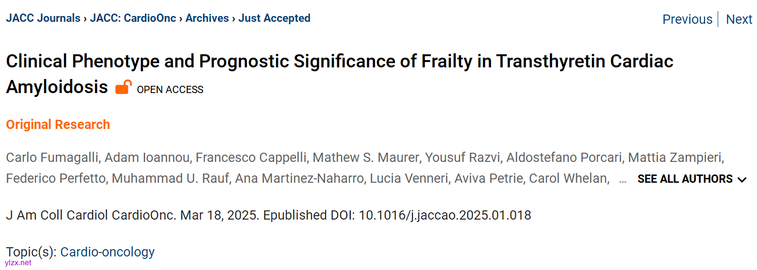 Carlo Fumagalli,et al.Clinical Phenotype and Prognostic Significance of Frailty in Transthyretin Cardiac Amyloidosis.JACC: CardioOncology.2025.https://www.jacc.org/doi/10.1016/j.jaccao.2025.01.018