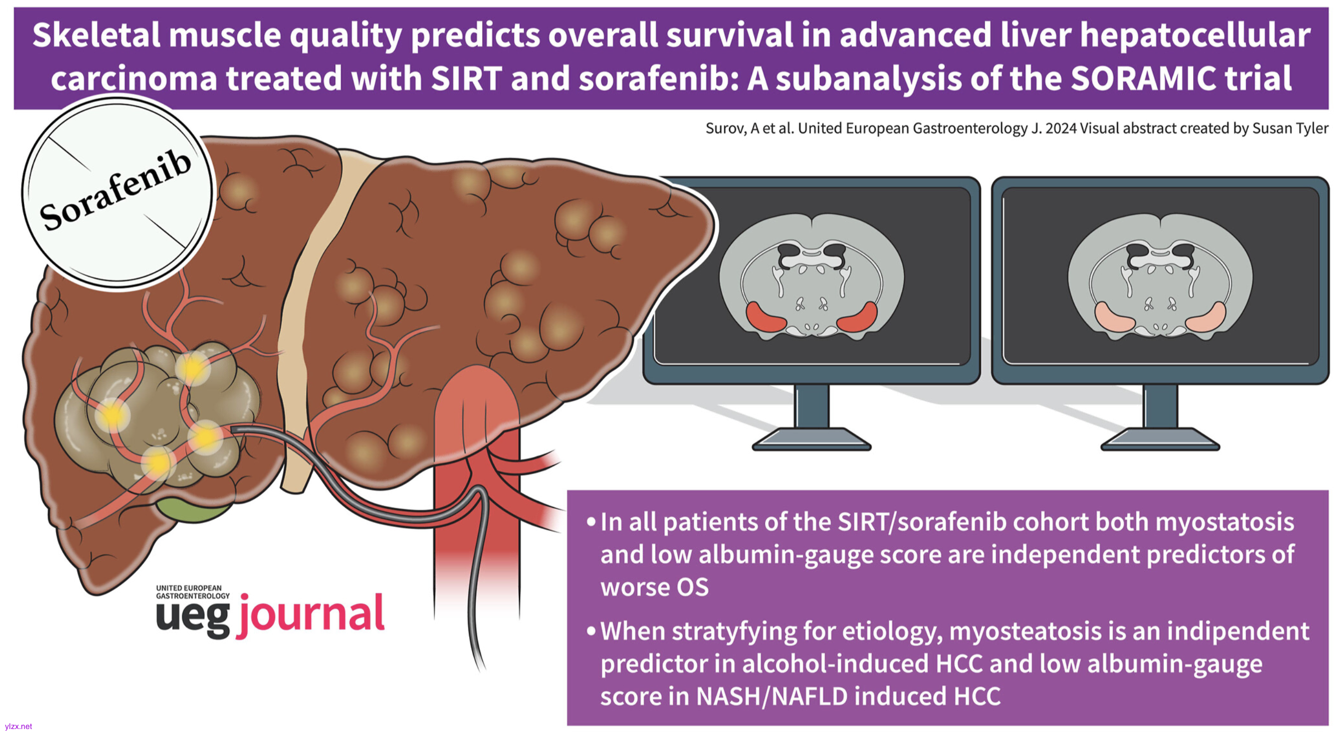 肝细胞癌(Hepatocellular Carcinoma, HCC)是全球范围内发病率和死亡率较高的恶性肿瘤之一,尤其是晚期HCC患者的总体生存率(Overall Survival, OS)较低,治疗选择有限。近年来,研究发现骨骼肌质量及其相关参数(如肌少症、肌肉脂肪浸润等)与癌症患者的预后密切相关。然而,这些参数在晚期HCC患者中的具体作用尚不明确,特别是在接受不同治疗方案(如选择性内放射治疗[SIRT]联合索拉非尼或单独使用索拉非尼)时的影响尚未深入探讨。这项研究由来自德国波鸿鲁尔大学的Alexey Surov教授及其团队于2024年10月发表在《United European Gastroenterology Journal》期刊(IF:5.8)。该研究通过分析SORAMIC试验数据,评估了骨骼肌质量对接受SIRT联合索拉非尼或仅接受索拉非尼治疗的晚期HCC患者总体生存的影响,并探讨了其与HCC病因学之间的关系。