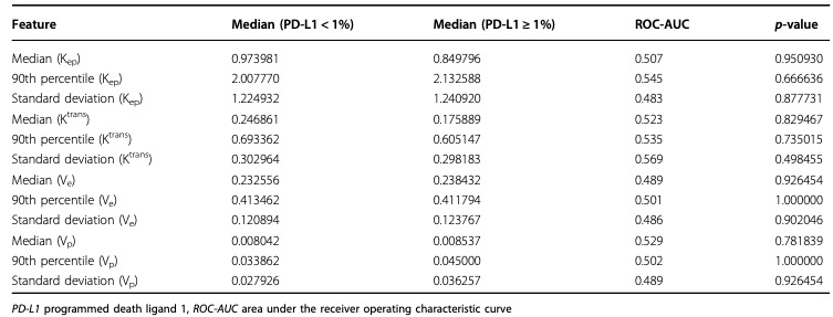 共纳入 38 例患者(平均年龄 68±9 岁,男性 28 例)。25 例患者(66%)存在 PD-L1 表达,13 例患者(34%)无 PD-L1 表达。13 例患者(34%)的 PD-L1 呈高表达,25 例患者(66%)的 PD-L1 呈低表达。使用最佳拟合配置(扩展托夫茨模型(ETM),搭配乔治乌(Georgiou)动脉输入函数以及峰值梯度(PG)法估计团注到达时间)提取了体素水平的药代动力学参数(R² = 0.79)。在 PD-L1 表达低于 50% 的组中,转运常数(Ktrans)的中位数(0.25 对比 0.12 每分钟的倒数,P = 0.02)、Ktrans 的标准差(0.32 对比 0.23 每分钟的倒数,P = 0.01)以及速率常数(Kep)的中位数(1.09 对比 0.59 每分钟的倒数,P = 0.02)均显著更高(ROC-AUC 为 0.71-0.76)。