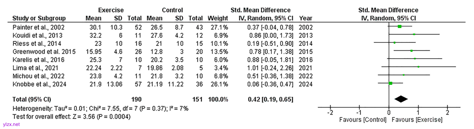· 最大摄氧量(V̇O₂peak):8项RCTs显示运动组较对照组显著提升3.87 mL/kg/min(95% CI: 1.75–5.99,p=0.0004),异质性低(I²=7%)。