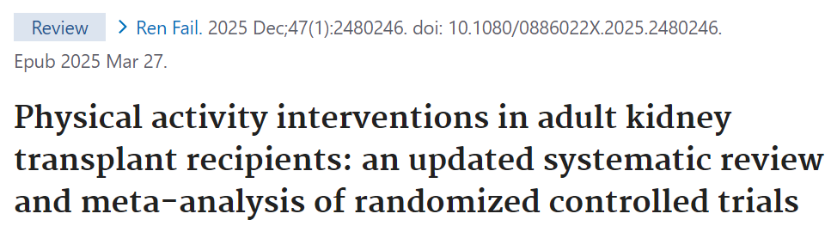 Billany RE, Bishop NC, Castle EM, Graham-Brown MPM, Greenwood SA, Lightfoot CJ, Wilkinson TJ. Physical activity interventions in adult kidney transplant recipients: an updated systematic review and meta-analysis of randomized controlled trials. Ren Fail. 2025 Dec;47(1):2480246. doi: 10.1080/0886022X.2025.2480246. Epub 2025 Mar 27. PMID: 40148080; PMCID: PMC11951324.