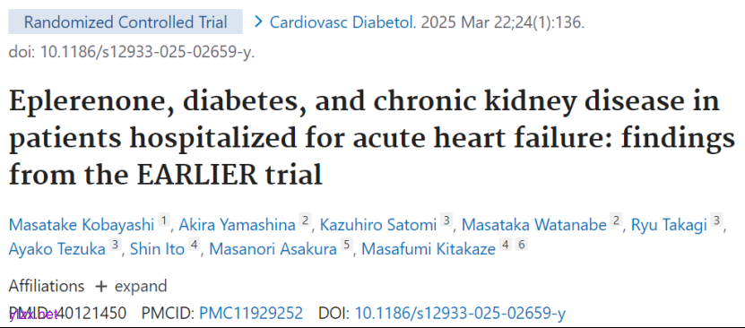 Kobayashi M, Yamashina A, Satomi K, Watanabe M, Takagi R, Tezuka A, Ito S, Asakura M, Kitakaze M. Eplerenone, diabetes, and chronic kidney disease in patients hospitalized for acute heart failure: findings from the EARLIER trial. Cardiovasc Diabetol. 2025 Mar 22;24(1):136. doi: 10.1186/s12933-025-02659-y. PMID: 40121450; PMCID: PMC11929252.